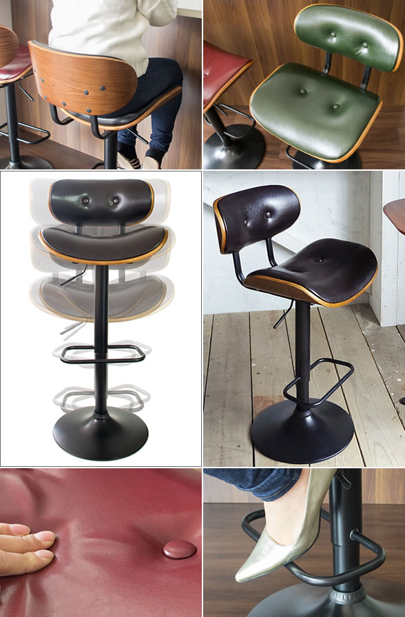 木目が美しい天然木の突板を使用した木板に、中にウレタンの入った肌触りの良い合成皮革を合わせたバーチェアは座り心地もバツグン♪