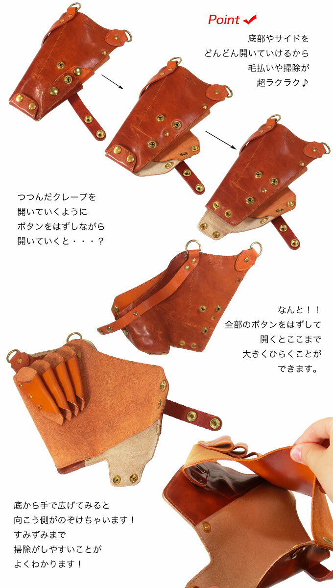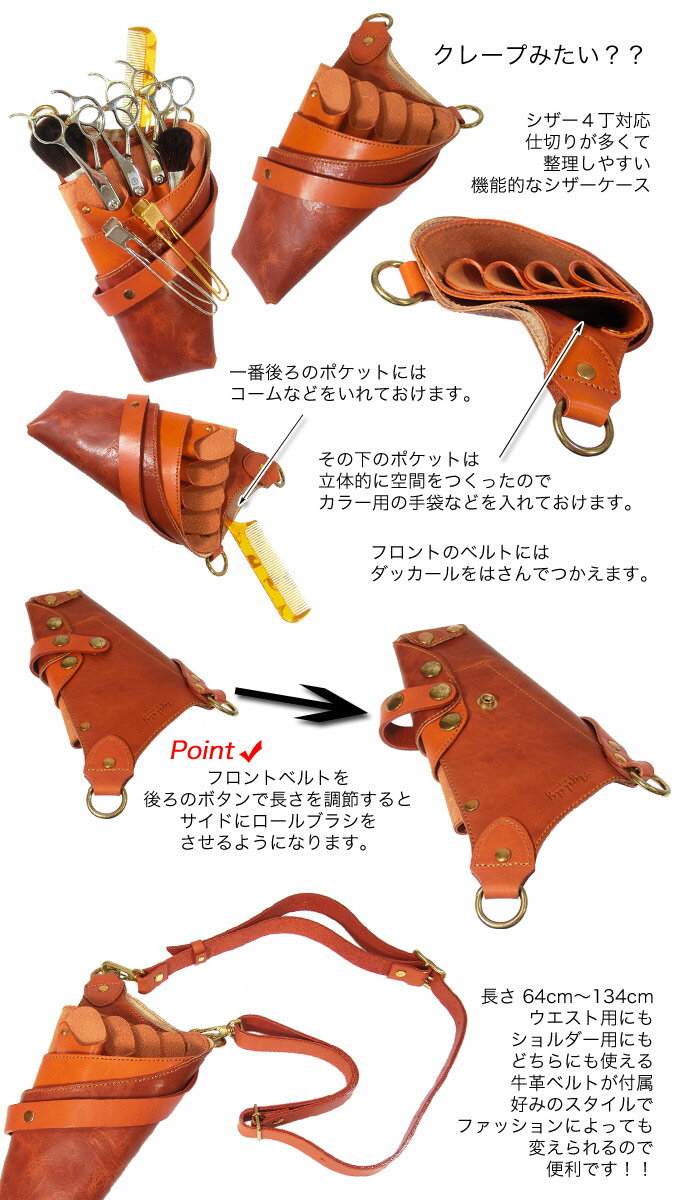 【AGILITY Pro(アジリティ プロ)】 クレープ −crepe- 素 材 牛革 サ イ ズ W6~13×H21~24×D2.5~4(cm) 付 属 品 20mm巾ウエスト/ショルダー兼用ベルト 対応シザー本数:4本 特 徴 まるでクレープみたいなデザイン シザーは4丁対応。